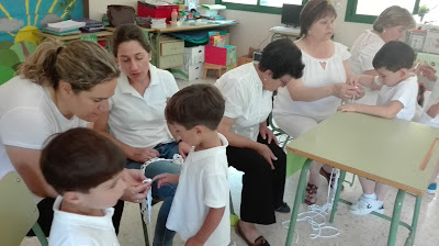 Aprendemos la artesanía, confeccionando parte de la cadeneta que será llevada a Córdoba con el fin de abrazar la mezquita catedral en señal de paz entre todos los seres humanos. Todos y todas colaboramos: abuelas, mamás, maestros, maestras y, los más importantes, el futuro, los niños y niñas.